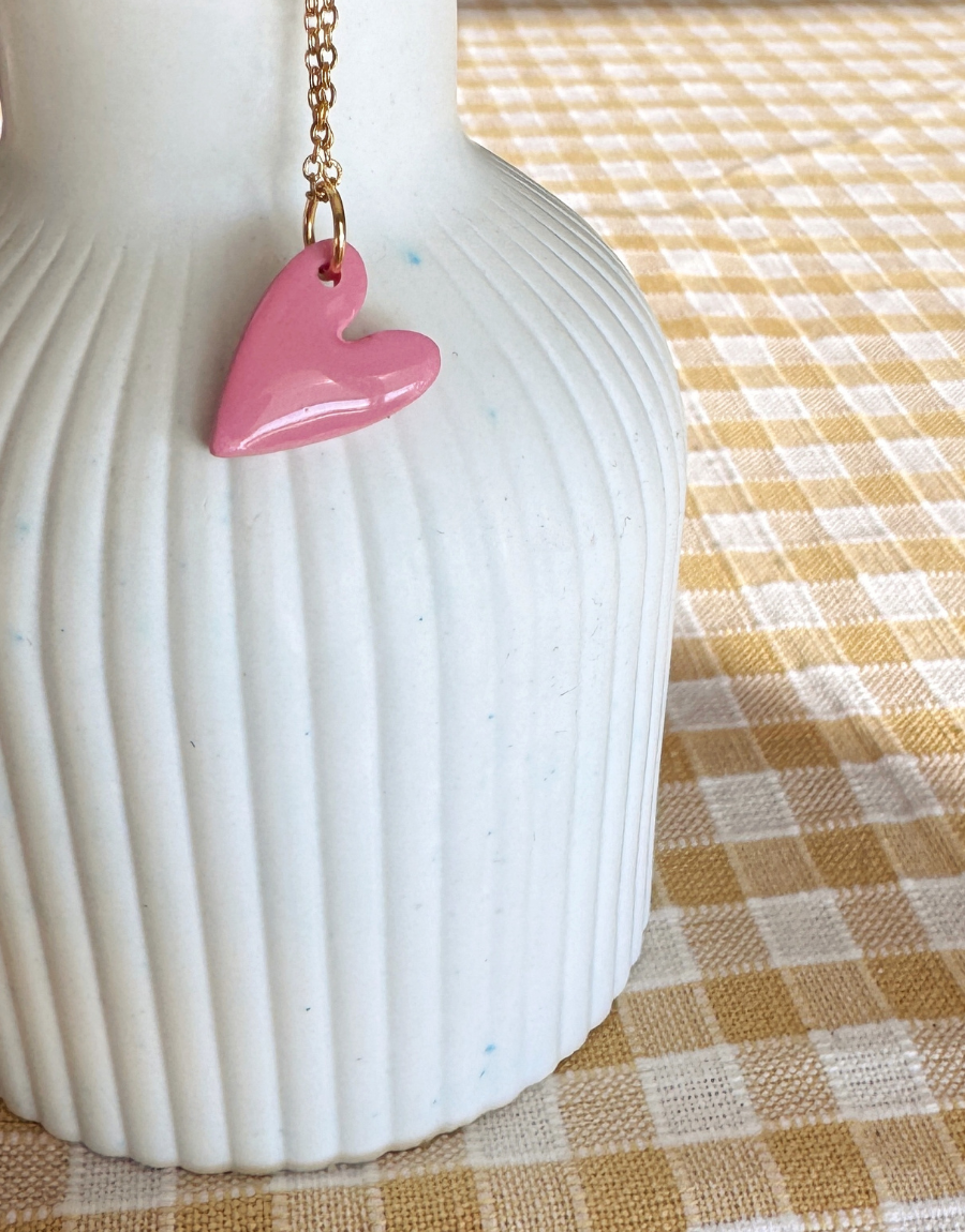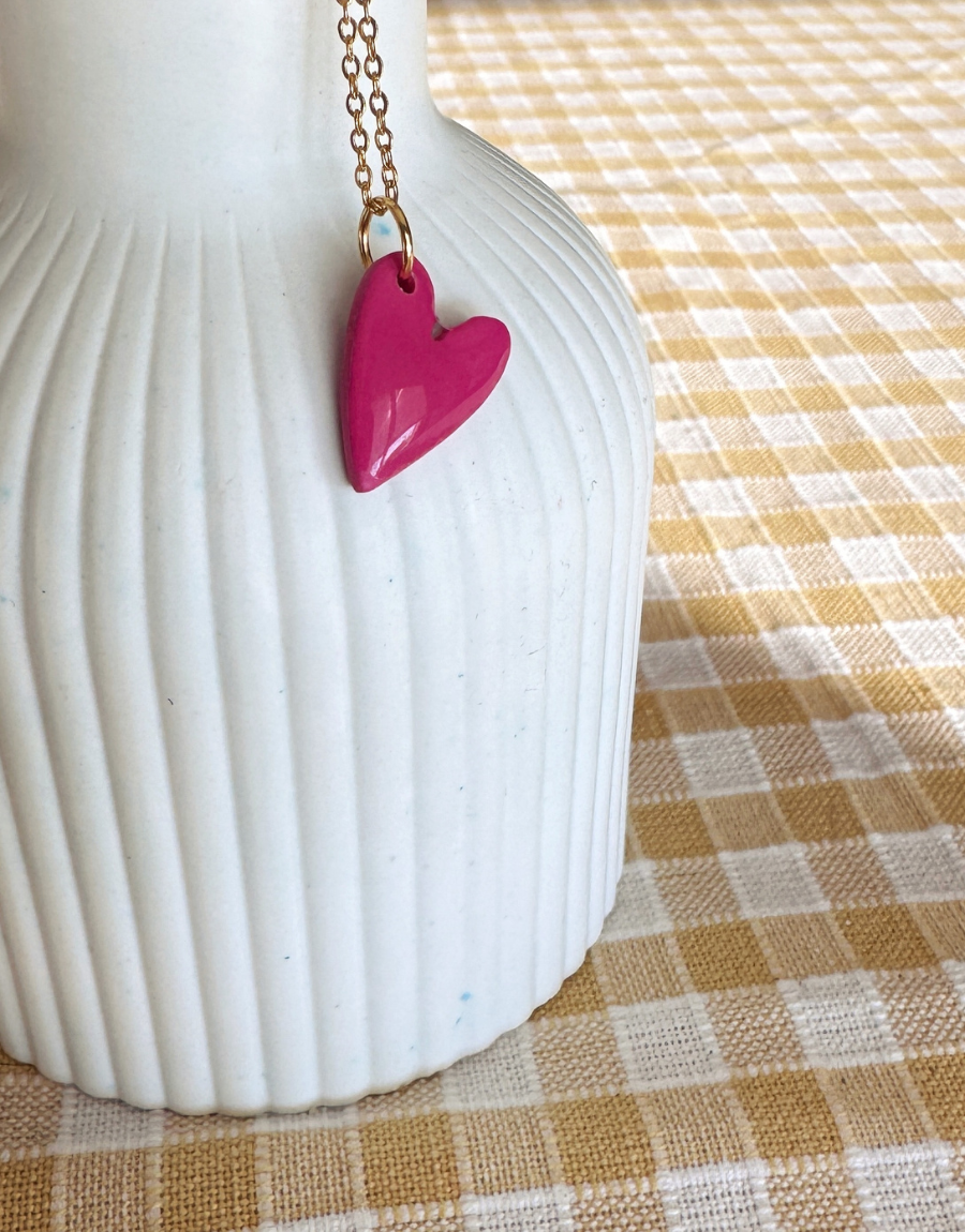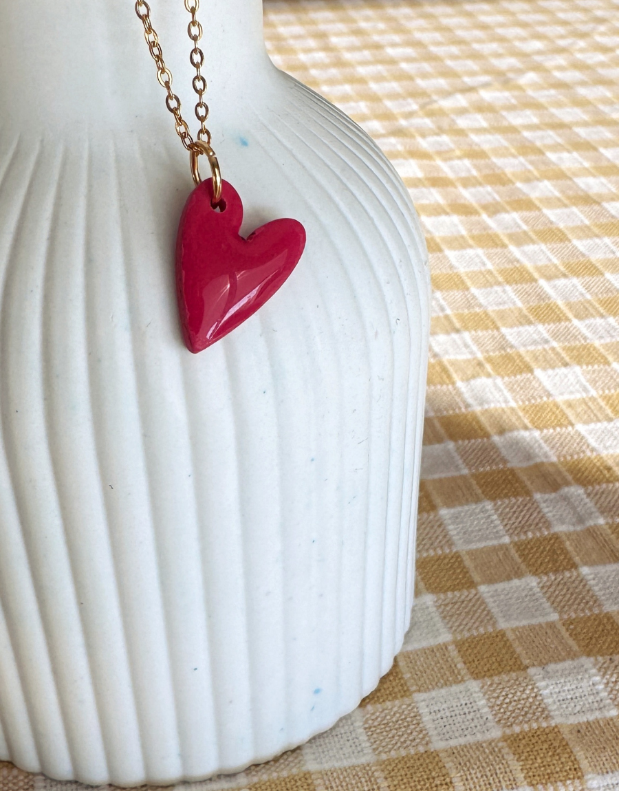 Los Mini Love son collares con colgante de corazón hechos a mano en arcilla polimérica, moldeados uno a uno y montados en cadena dorada fina. El acabado es suave y ligeramente irregular, lo que hace que cada corazón tenga su propia personalidad.