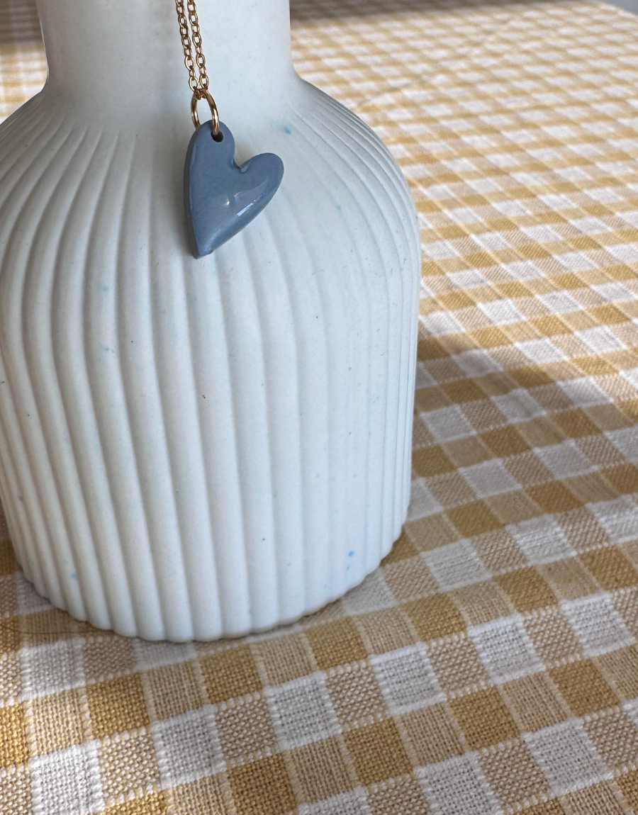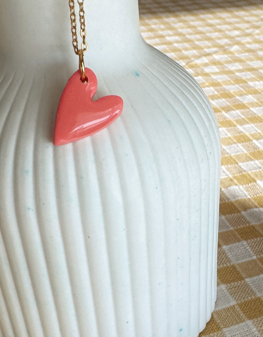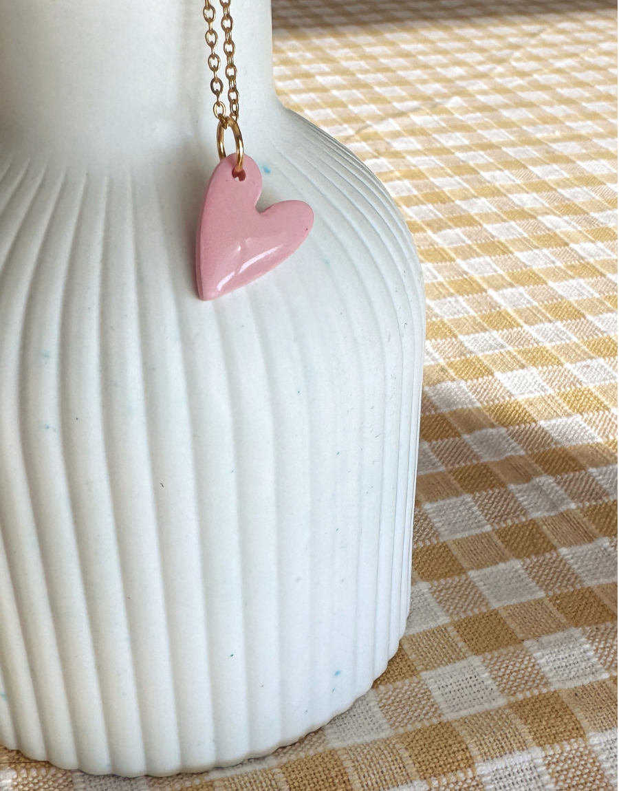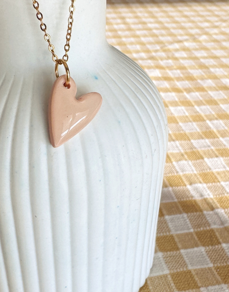 Los Mini Love son collares con colgante de corazón hechos a mano en arcilla polimérica, moldeados uno a uno y montados en cadena dorada fina. El acabado es suave y ligeramente irregular, lo que hace que cada corazón tenga su propia personalidad.