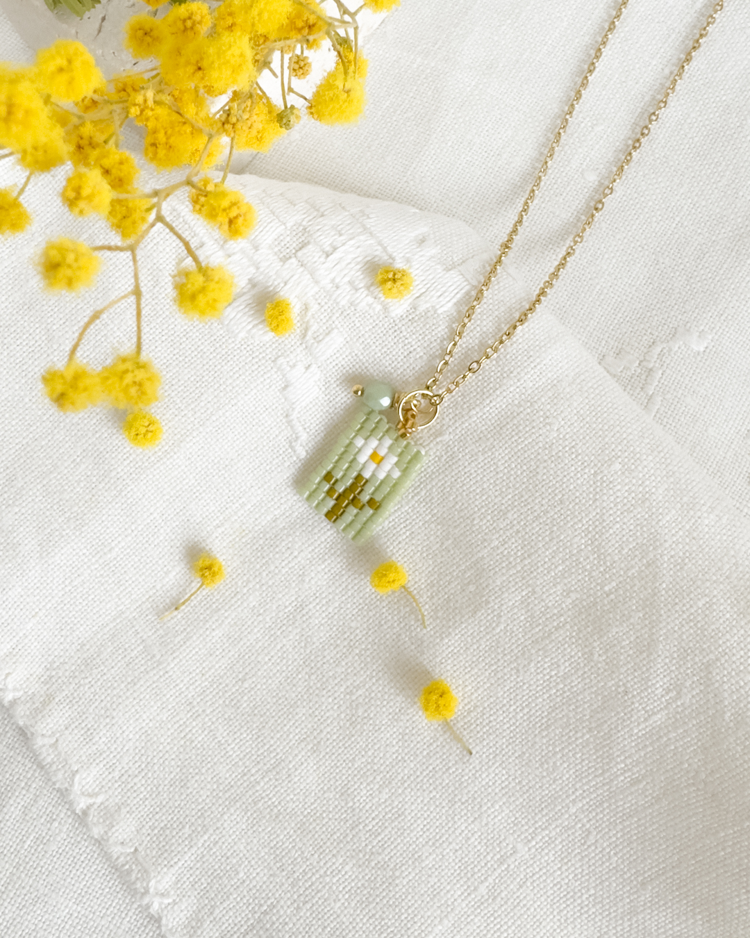 Colgante de cuentas de cristal Miyuki que cuelga de una fina cadena de acero inoxidable, detalle de abalorio de cristal checo junto al colgante principal.