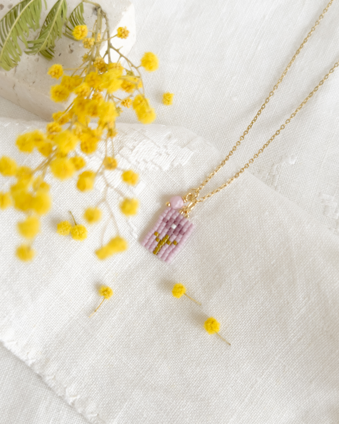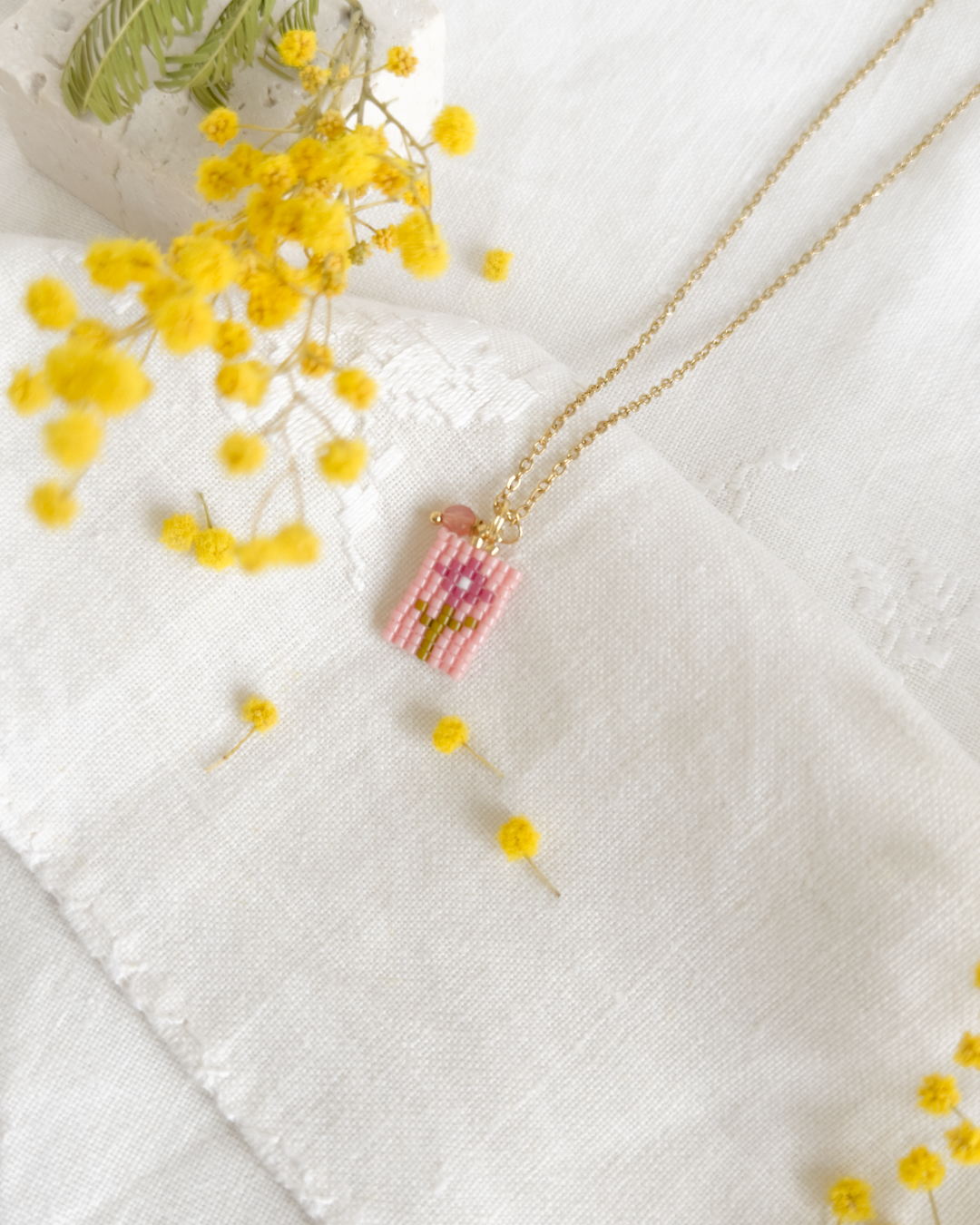 Cuelga de una cadena fina de acero bañada en oro y lleva una pequeña cuenta facetada de cristal checo, como si la flor guardara un secreto en el centro.