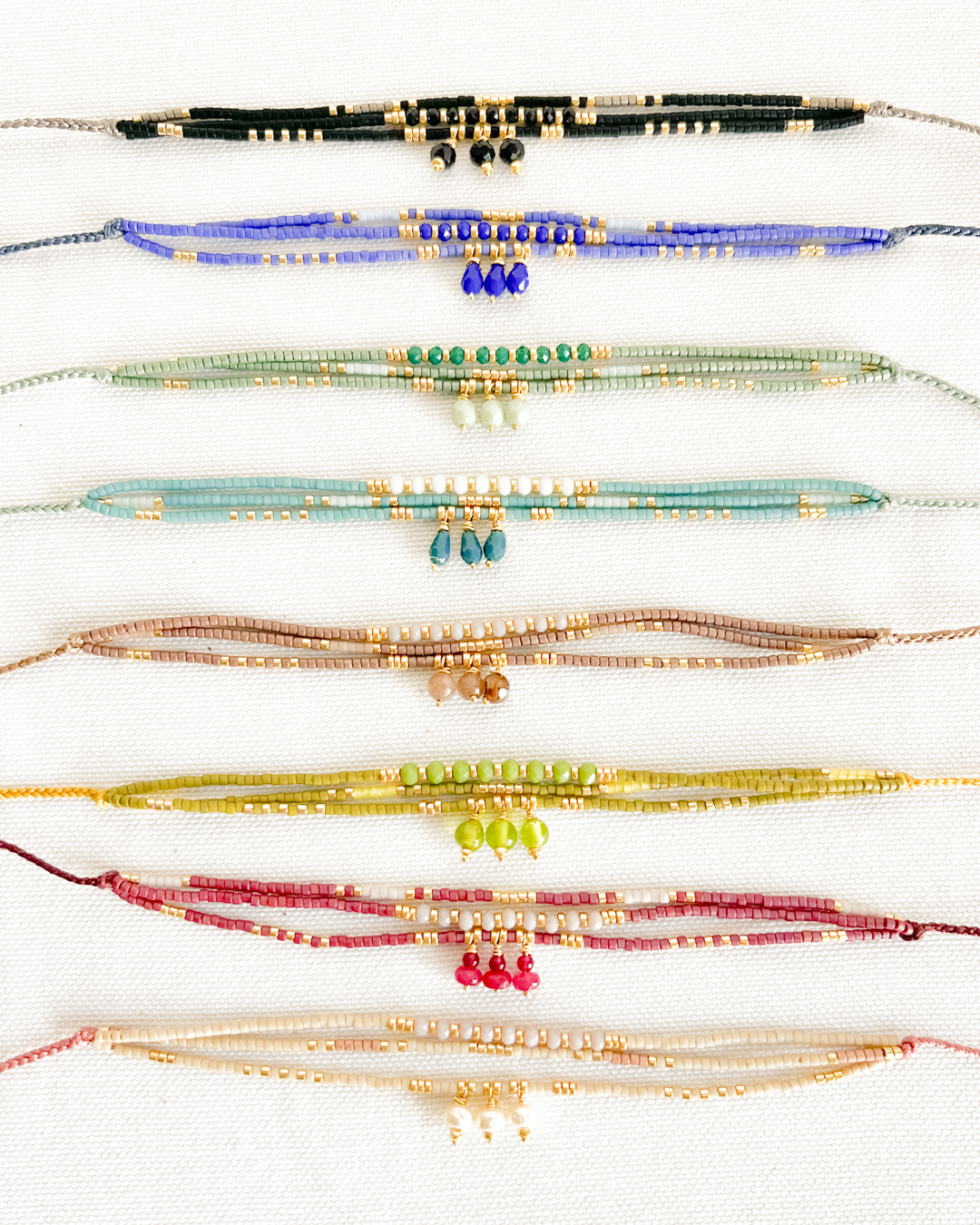 Cuentas de cristal miyuki, cuentas de cristal checo tallado, cuentas de plata bañada en oro. Hilo de nylon muy resistente.