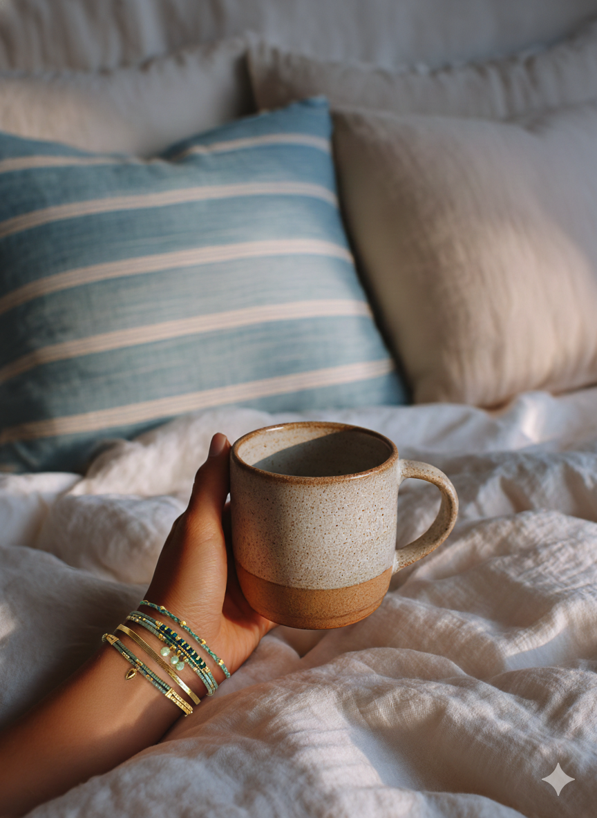 Tres pulseras en una con tonos inspirados en el Mediterráneo invernal. Hecha a mano con cuentas de cristal y detalles dorados que aportan luz a los días fríos.