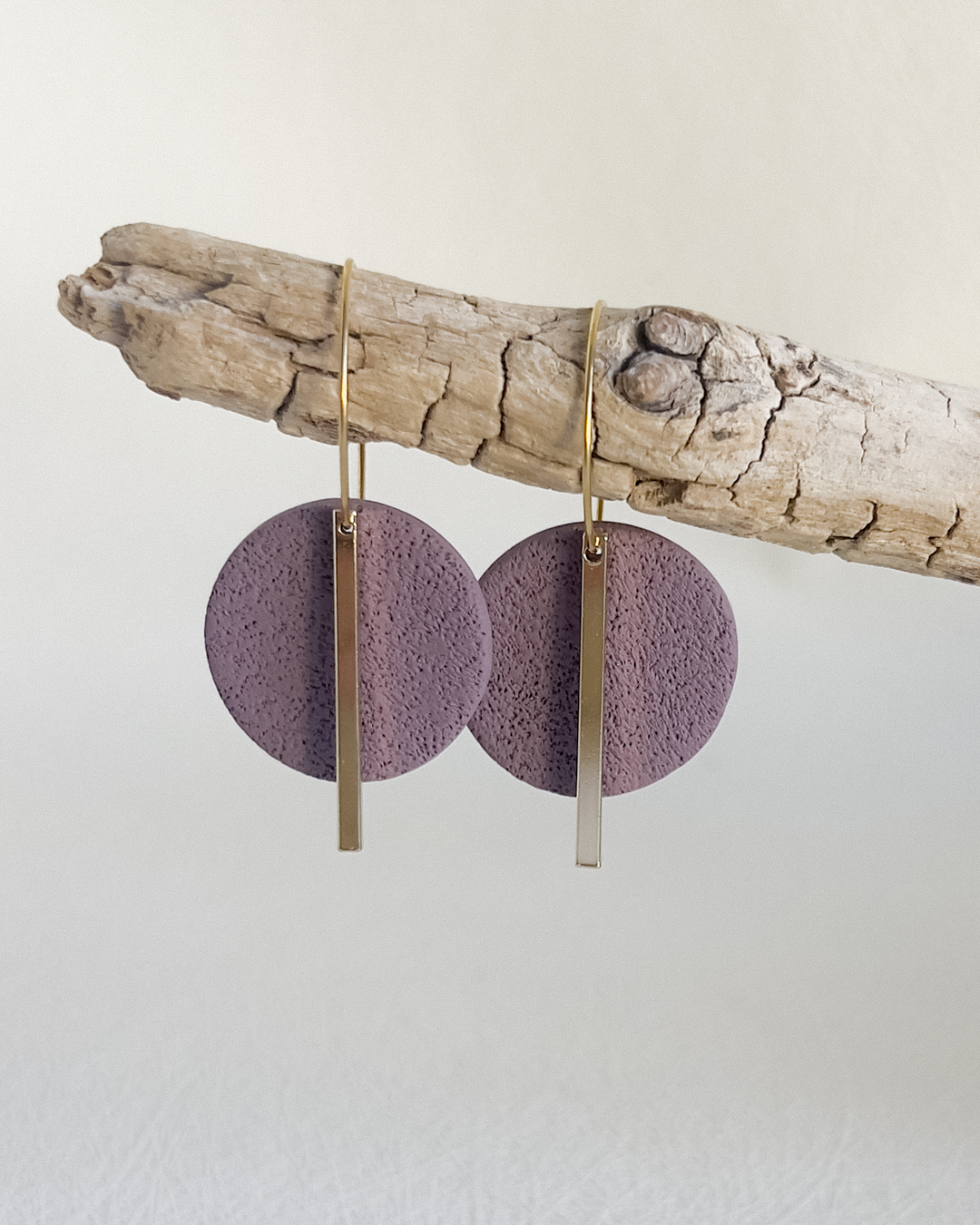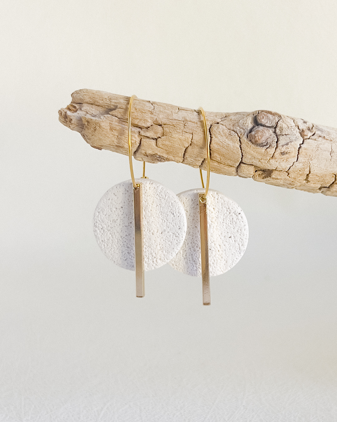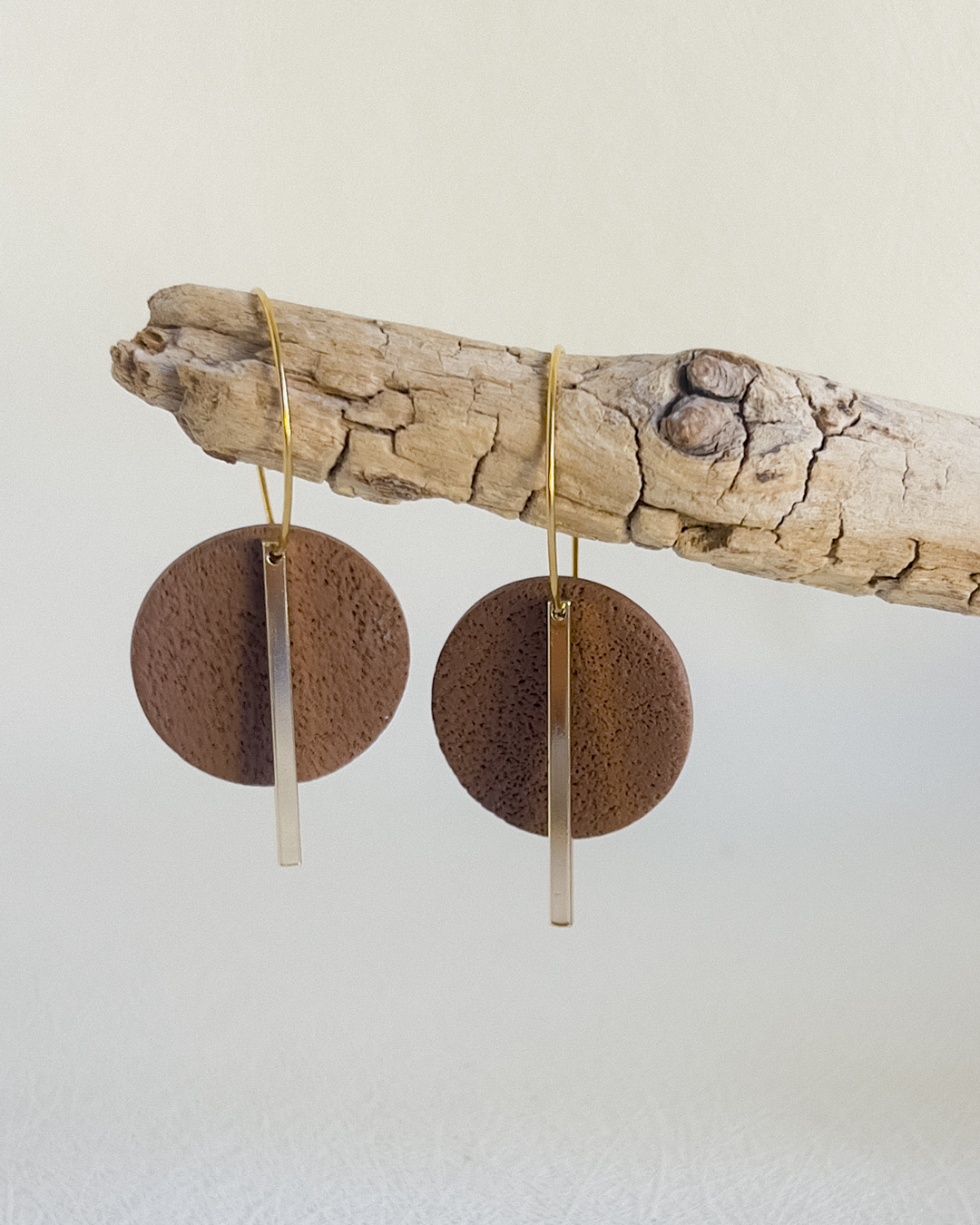 El disco de arcilla texturizada atravesada por una línea dorada vertical que representa el eje que nos centra y nos conecta. Su ligereza y geometría los convierten en una pieza versátil, capaz de acompañar tanto momentos cotidianos como instantes especiales.
