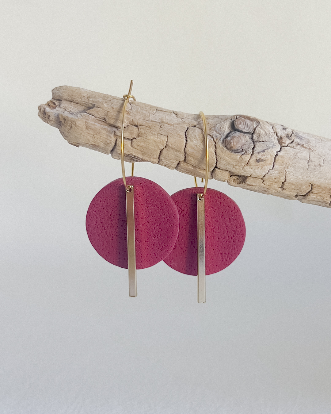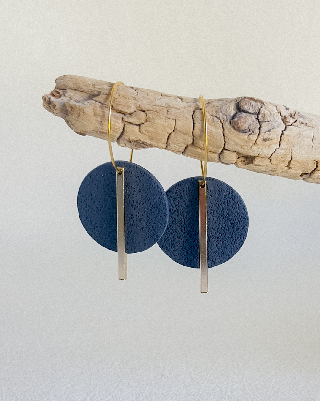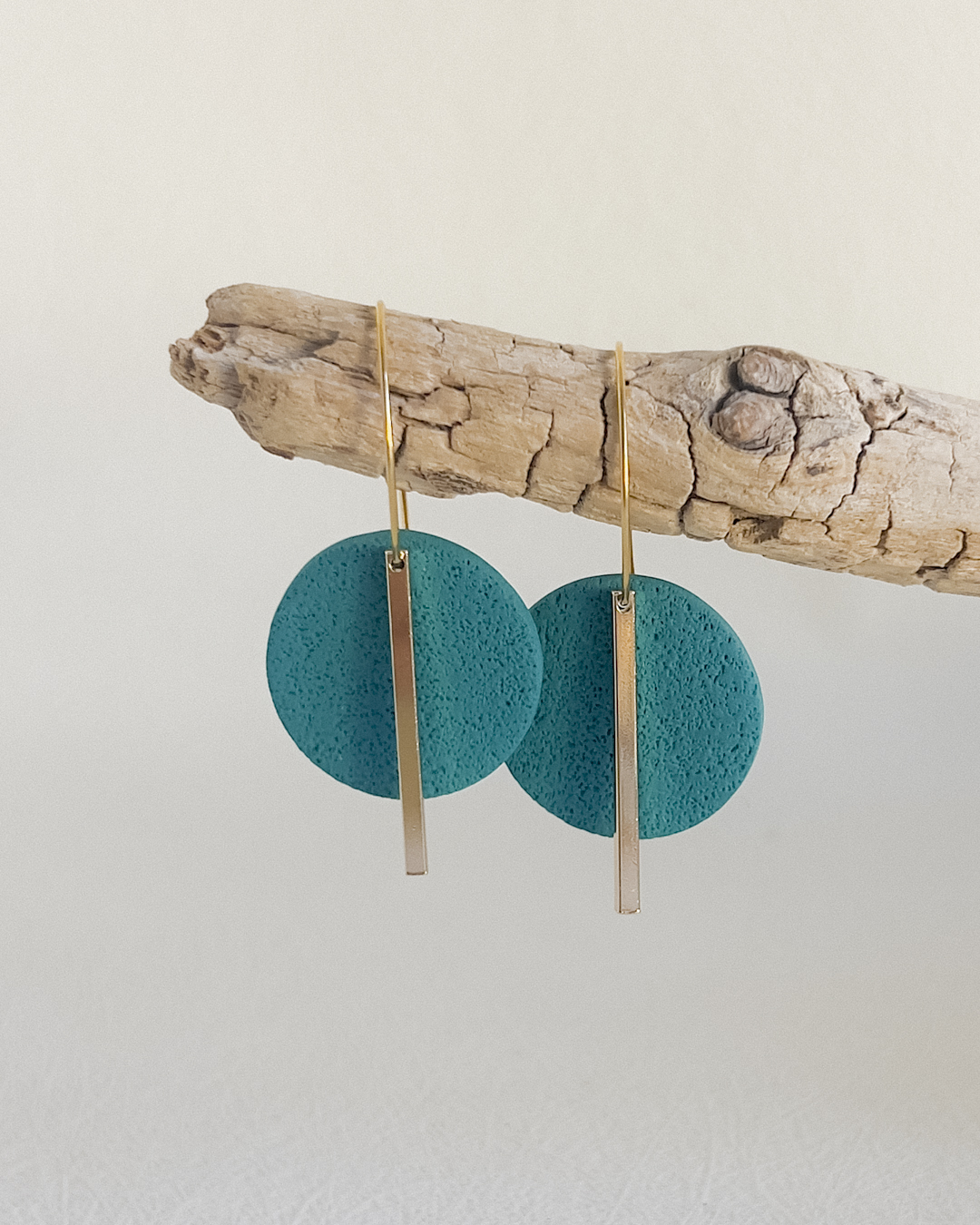 El disco de arcilla texturizada atravesada por una línea dorada vertical que representa el eje que nos centra y nos conecta. Su ligereza y geometría los convierten en una pieza versátil, capaz de acompañar tanto momentos cotidianos como instantes especiales.