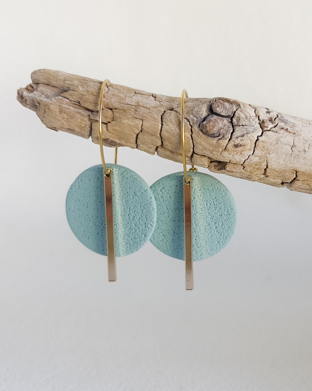 Arcilla polimérica, anillas doradas de acero inoxidable, trasera de acero inoxidable.